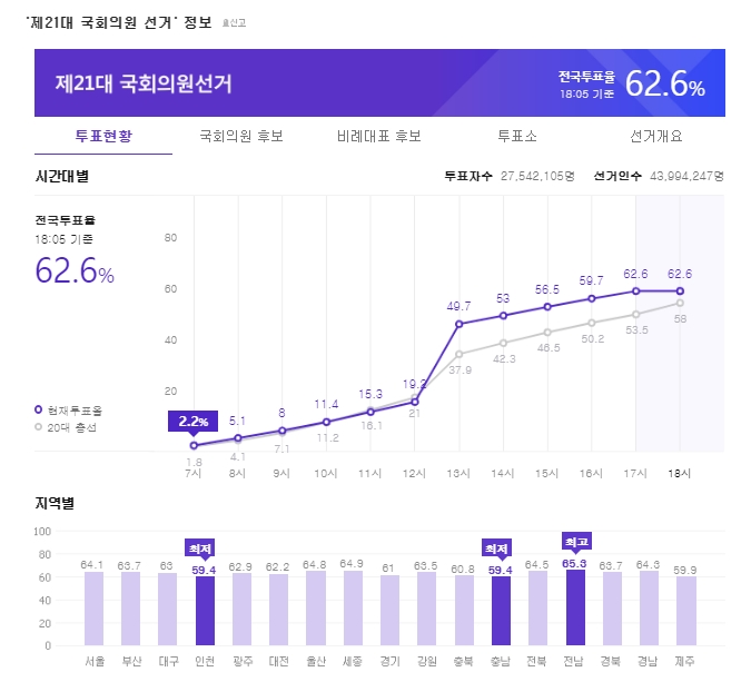 | [4.15총선]현재 17시 기준 전국투표율 62.6% 기록 (0) | 2020.04.15 |