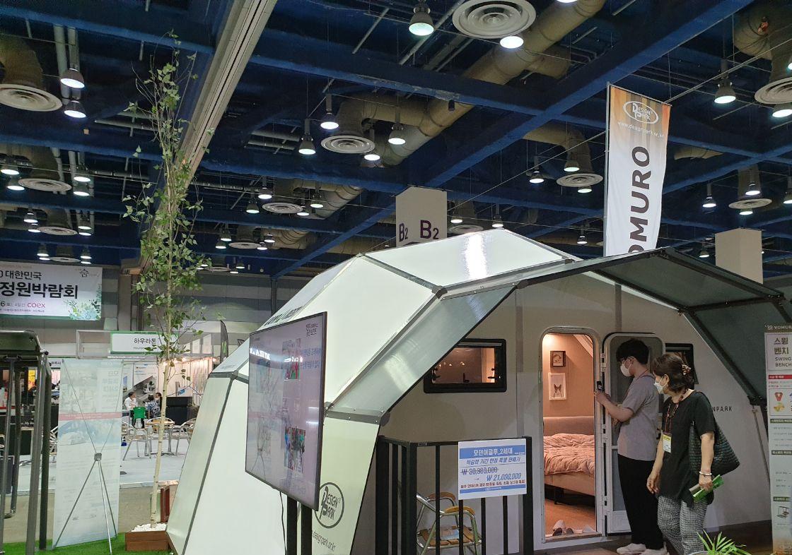 (주)디자인파크개발은 이번 박람회를 통해 기존 모던이글루 업그레이드 버전인 ‘모던이글루2세대’를 비롯해 카라반, 건식사우나, 모듈러수영장 등 캠포레스트 브랜드 제품을 선보였으며,박람회를 계기로 휴게시설 분야 진출을 선언하고 고재파고라와 온열의자, 스마트가든볼, 스윙벤치 등의 제품을 선보였다.