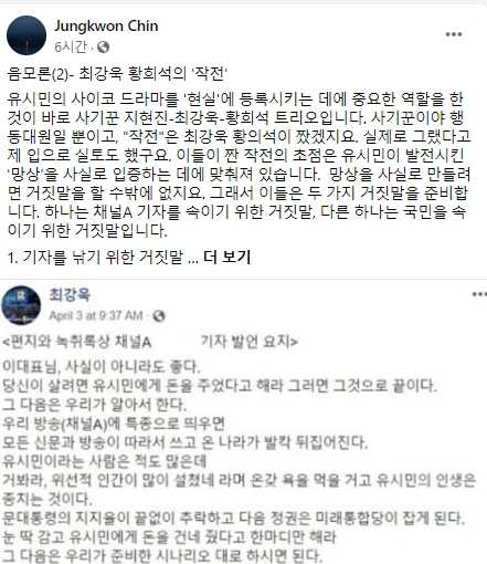다음은 진 전교수가 페이스북에 게재한 음모론(2)- 최강욱 황희석의 '작전'내용의 전문이다.