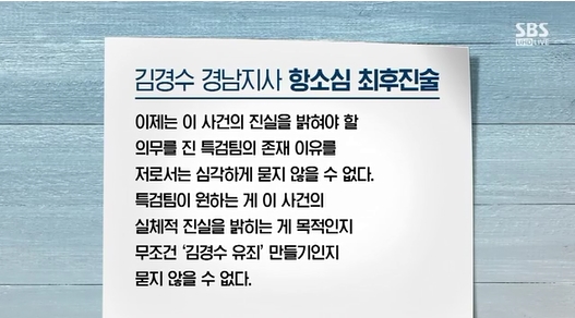 김 지사는 특검을 비판하며, 최후진술에서 재판부에 억울함을 토로하면서 "마지막까지 제가 할 수 있는 모든 걸 하겠습니다"고 밝혔다.