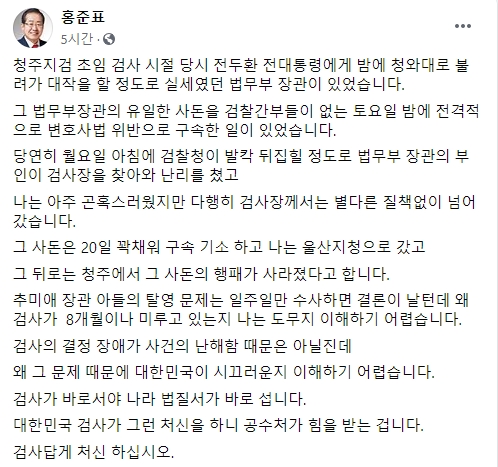 홍 의원은"추미애 장관 아들의 탈영 문제는 일주일만 수사하면 결론이 날턴데 왜 검사가 8개월이나 미루고 있는지 나는 도무지 이해하기 어렵다"며"검사의 결정 장애가 사건의 난해함 때문은 아닐진데 왜 그 문제 때문에 대한민국이 시끄러운지 이해하기 어렵다"고 비난하면서"검사가 바로서야 나라 법질서가 바로 선다"며"대한민국 검사가 그런 처신을 하니 공수처가 힘을 받는 겁니다. 검사답게 처신 하십시오"라고 직격탄을 날렸다.