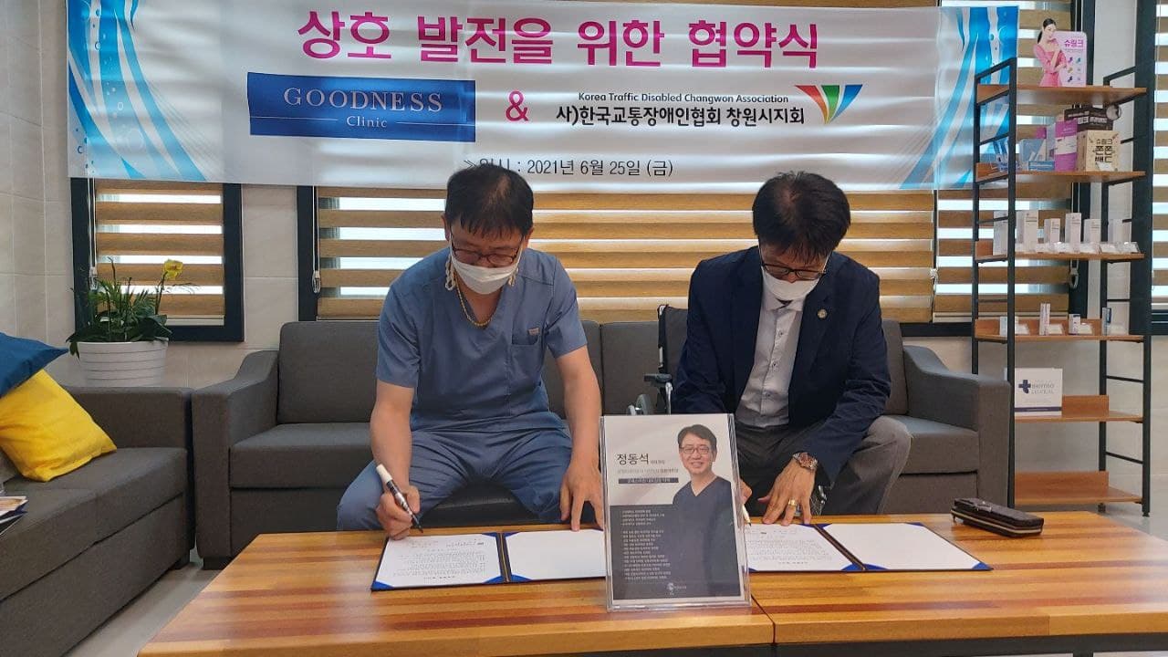 [시사우리신문](사)한국교통장애인협회 창원시지회 (회장 홍민식)와 굿네스 의원(원장 정동석)은 지난 6월25일 굿네스의원 본점에서 지난 6월 25일 오후 굿네스의원 본점에서 상호 우호증진과 사회공헌 활동의 나눔 봉사이념에 함께하고 지역사회 의 신뢰를 바탕으로 상호발전을 위한 협약서를 체결했다.