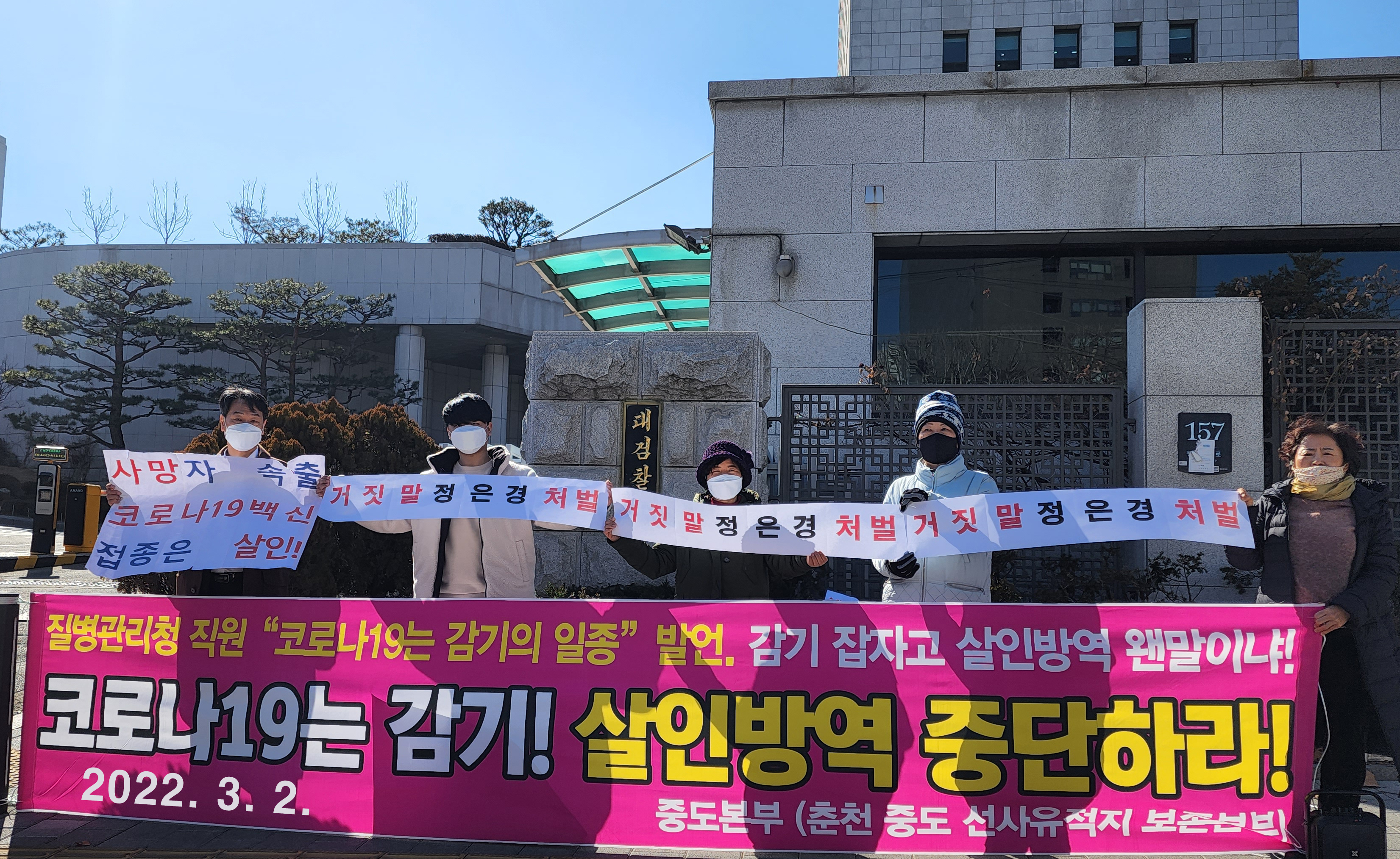 2일 오후 시민단체 중도본부(상임대표 김종문)은 대검찰청 앞에서 기자회견을 개최하고 질병관리청이 허위의 설명자료를 배포하여 중도본부의 업무를 방해하고 국민들에게 코로나19가 감기임을 은폐했다며 정은경 청장과 관련 공무원들을 형사고발 했다.