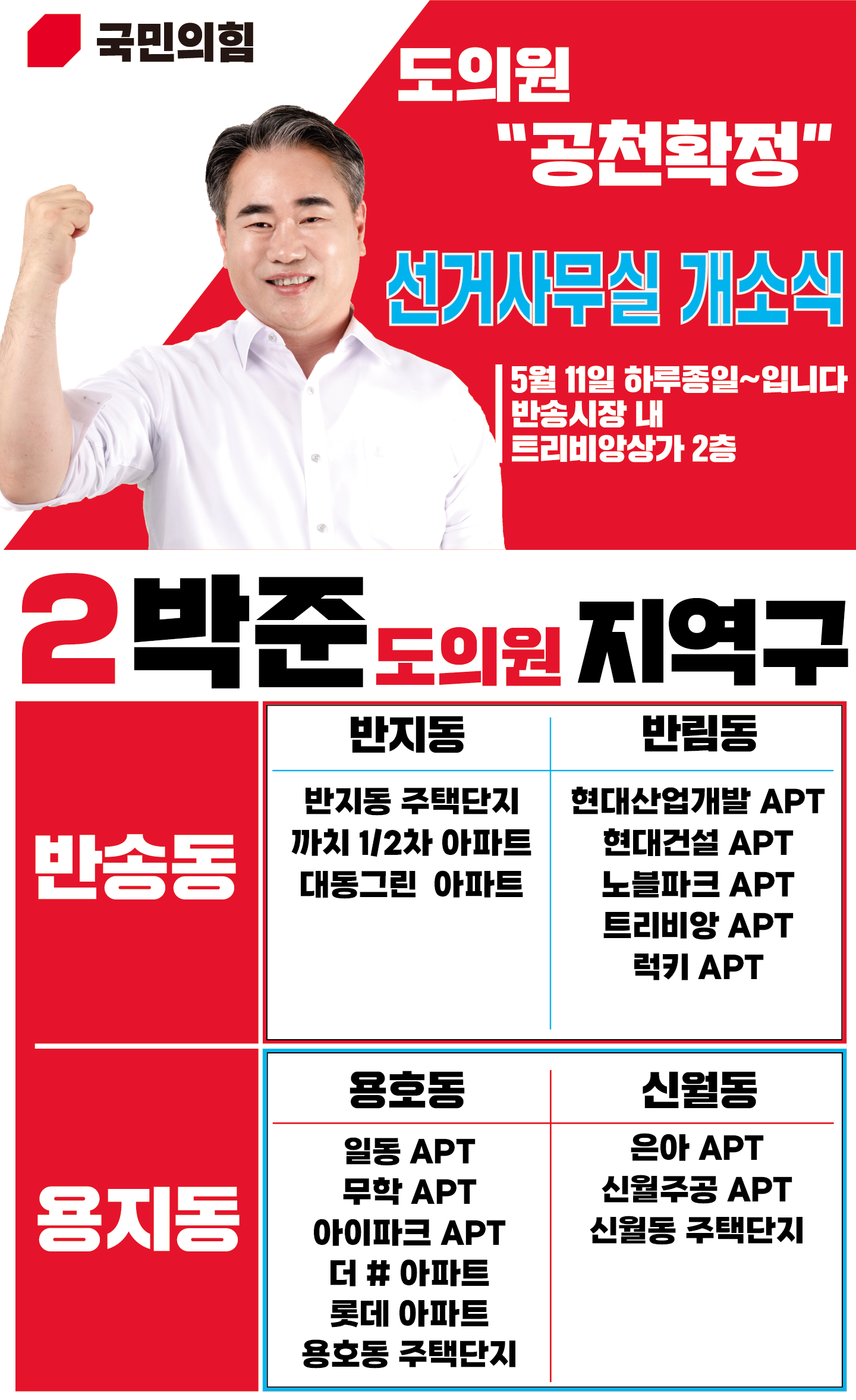 [경남우리신문]국민의힘 승리 2022! 제8회 전국동시지방선거 "지역을 새롭게 시민을 힘나게" 를 내세운 슬로건으로 박준 국민의힘 경상남도의원 창원시제4선거구 (반송·용지·신월동) 후보 선거사무소 개소식이 오는 11일 오전 10시부터 창원시 성산구 반송시장 내 트리비앙 상가1동 2층에서 개최된다고 9일 밝혔다.