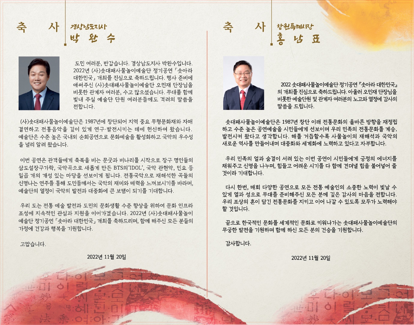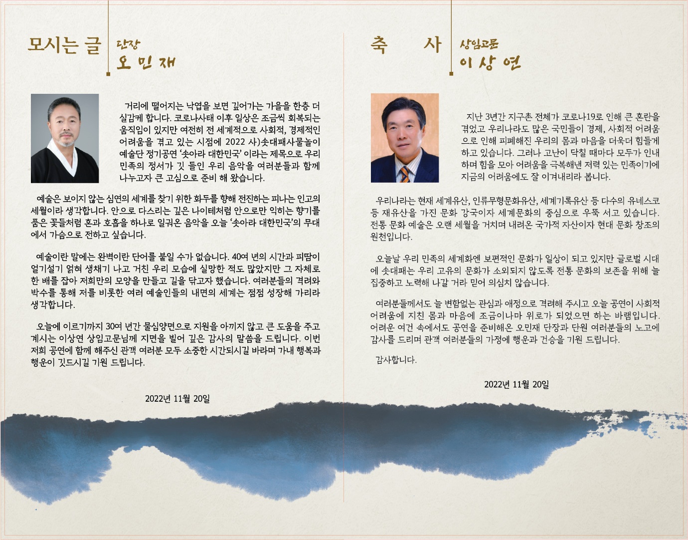 솟대패사물놀이예술단 오민재 단장은 모시는 글을 통해"코로나19 사태 이후 일상은 조금씩 회복되는 움직임이 있지만 여전히 전 세계적으로 사회적,경제적인 어려움을 겪고 있는 시점에 2022 (사) 솟대패사물놀이예술단 정기공연인 '솟아라!대한민국'이라는 제목으로 우리 민족의 정서가 깃 들인 우리 음악을 여러분들과 함께 나누고자 큰 고심으로 준비해 왔다"며"예술은 보이지 않는 심연의 세계를 찾기 위한 화두를 향해 전진하는 피나는 인고의 세월이라 생각하고,아능로 다스리는 깊은 나이테처럼 안으로만 익히는 향기를 품은 꽃들처럼 혼과 호홉을 하나로 일궈온 음악을 '솟아라!대한민국'의 무대에서 가슴으로 전하고 싶다"고 인사했다.