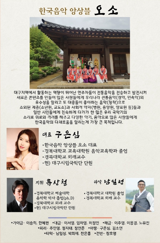 한국음악 앙상블 오소(대표 구은심)는 대구지역에서 활동하는 역량이 뛰어난 연주자들이 전통음악을 전승하고 발전시켜 새로운 콘텐츠를 만들어 많은 사람들에게 우리나라 전통음악(정악,민속악)의 우수성을 알리고 한 많은 우리 국악기의 소리로 위로와 격려를 해주고,다양한 악기,음악으로 한국음악의 다채로움을 알리는 단체다.