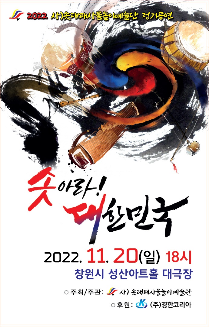 [시사우리신문] 2022 (사) 솟대패사물놀이예술단 정기공연 '솟아라!대한민국'이 오는 11월 20일 오후 6시 창원시 성산아트홀 대극장에서 대단원의 막이 오른다.
