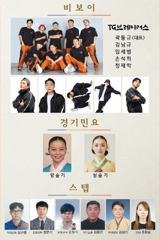 비보이 공연 TG브레이커스(대표 곽동규),김남규,임세범,손석희,정재학 이 출연하고 경기민요에는 양슬기,성슬기가 출연한다.