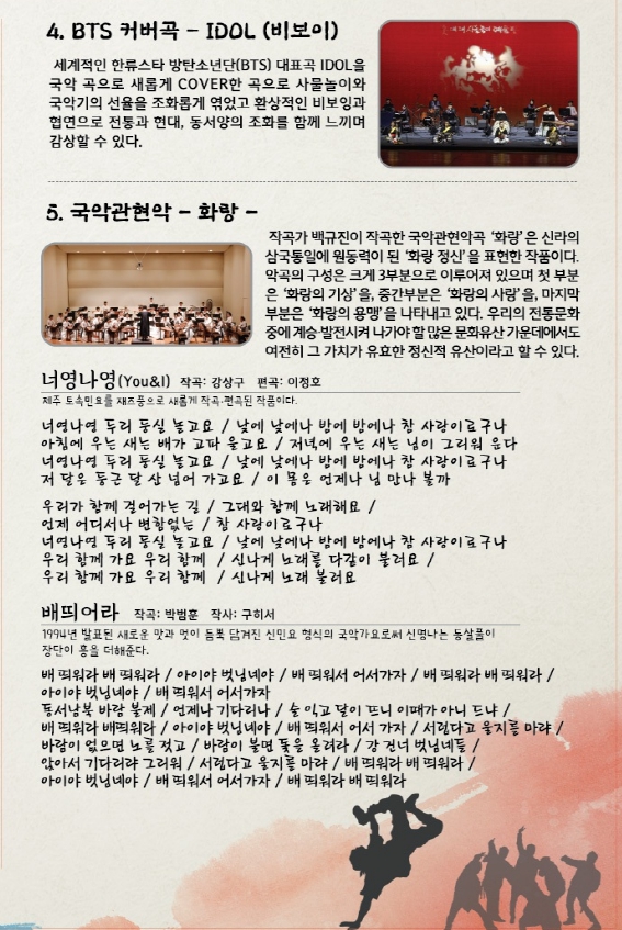 -세계적인 한류스탄 방탄소년단(BTS)대표곡인 IDOL을 국악곡으로 새롭게 커버한 곡으로 사물놀이와 국악기의 선율을 조화롭게 콜라보레이션으로 선보이는 퓨전공연으로 비보이와 협연으로 전통과 현대,동서양의 조화를 함께 감상할 수 있다.