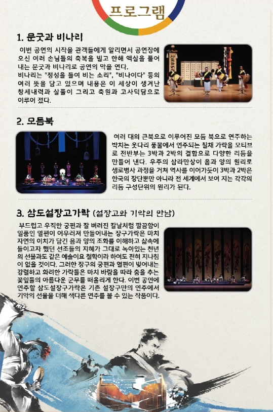 2022 (사) 솟대패사물놀이예술단 정기공연 '솟아라!대한민국' 프로그램은 다음과 같다.