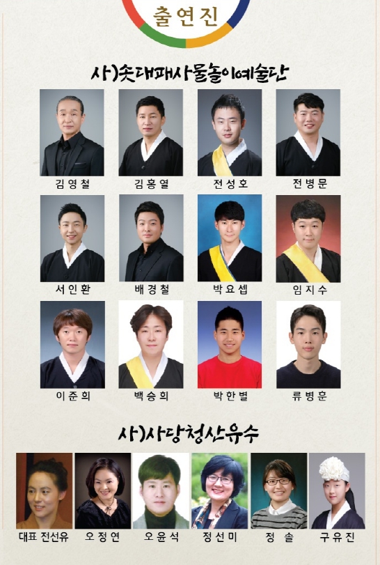 주최,주관 (사)솟대패사물놀이예술단 출연진은 오민재 단장,김영철,김홍열,전성호,전병문,서인환,배경철,박요셉,한석현,임지수,이준희,백승희,박한별,류병훈 단원들이 함께하며 (사)사당청산유수 진선유 대표,오정연,오윤석,정선미,정솔,구유진이 출연해 신명나고 흥겨운 사물놀이를 선사한다.