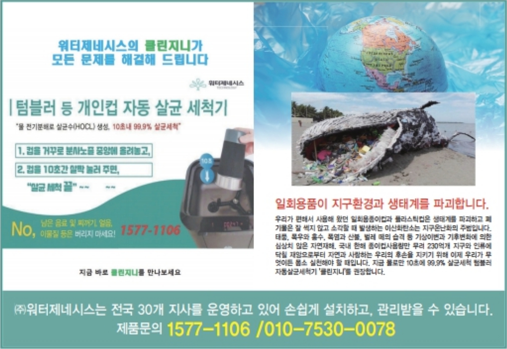 이에 따라 환경부 산화 기관 및 각 관공서,기업체,커피전문점,대학교,병원,학교 등에서 1,500개소에 물로만 10초에 99.9% 살균세척 텀블러 등 개인컵 자동살균세척기 제품을 설치하고 있습니다.