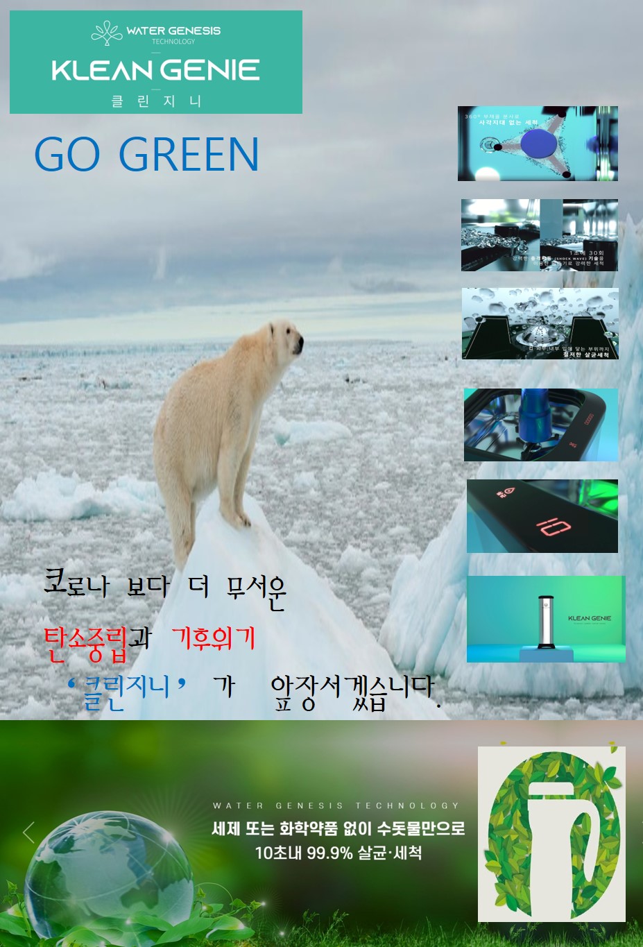 (주)워터제네시스는 환경적 가치와 사회적 가치를 실현하는 기업으로 조달청 혁신제품인 물로만 10초에 99.9% 살균세척 텀블러 자동살균세척기 ‘클린지니’를 개발하게 되었습니다.