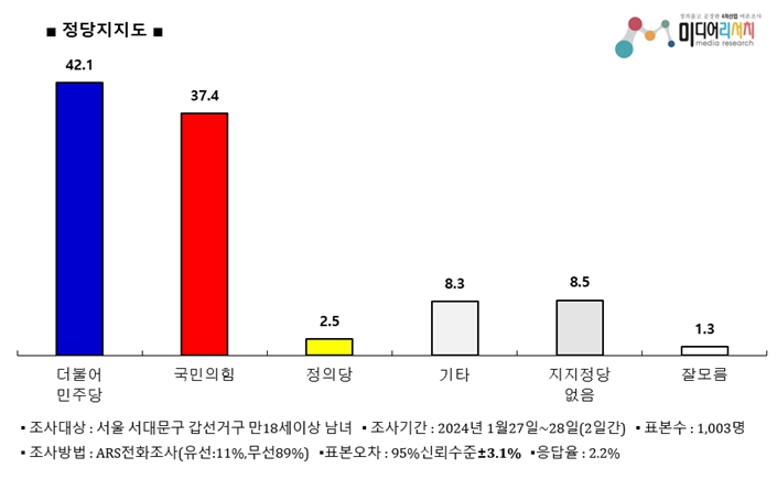 이번 여론조사는 지난 27일~28일 이틀간 서울 서대문갑 거주 만 18세 이상 성인 남녀 1003명 대상으로, 구조화된 설문지를 이용한 자동응답(ARS)조사 방식이며, 무선통신사 제공 휴대전화 가상번호를 활용한 무선전화(89%)·유선(11%)로 실시됐다. 응답률은 2.2%였고, 표본오차는 95% 신뢰수준에서 ±3.1%p다. 2023년 12월 말 기준 행정안전부 주민등록 인구 기준 성, 연령 지역별 가중치 부여(셀가중)를 적용했다. 자세한 사항은 중앙선거여론조사심의위원회 홈페이지를 참조하면 된다.