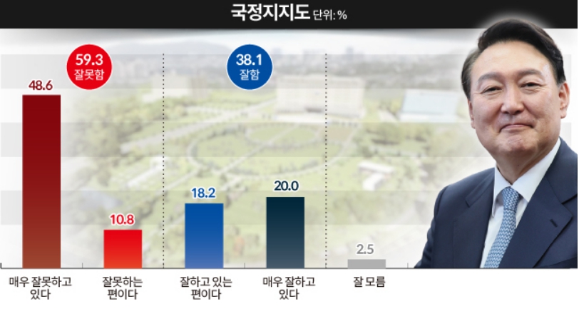 [시사우리신문]윤석열 대통령의 지지율이 소폭 하락해 30%대 후반을 기록했다는 여론조사 결과가 18일 발표됐다.