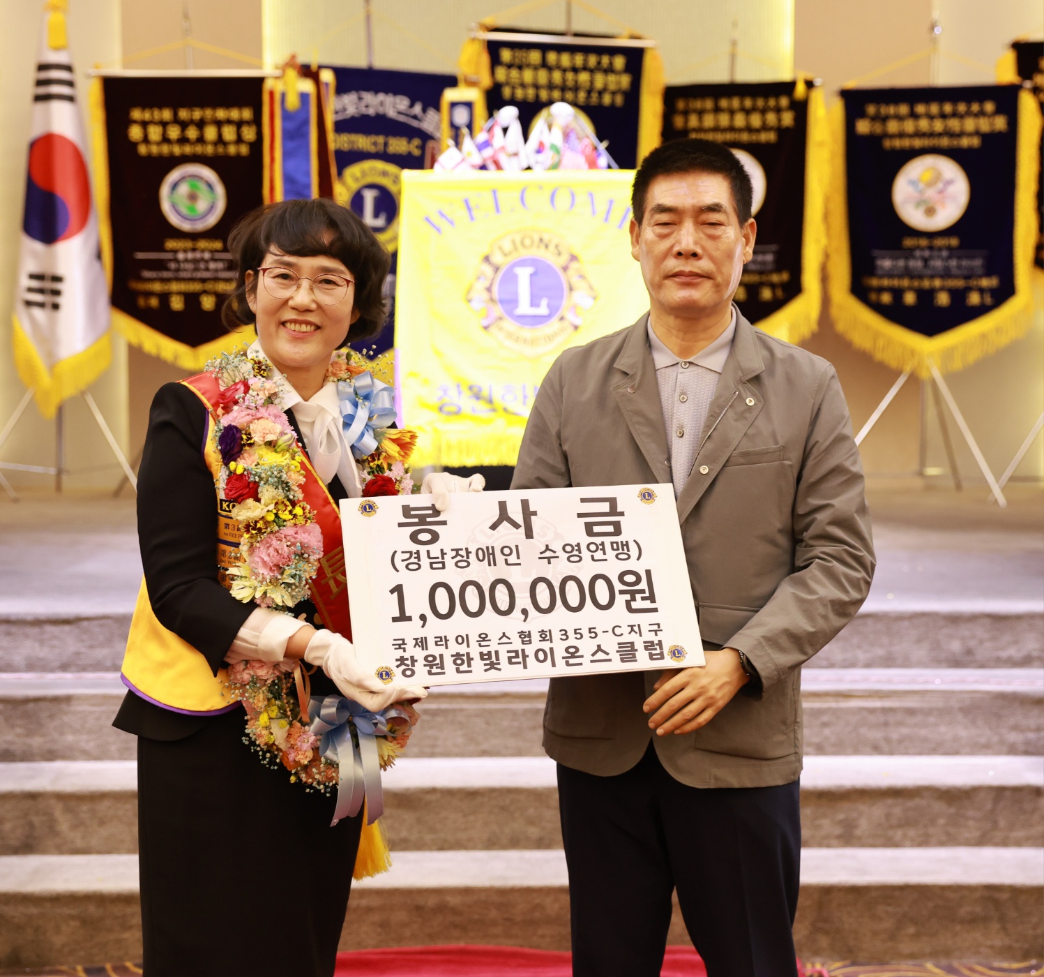 이날 클럽 창립 제25주년 기념식 및 제 25대 -26대 회장 이취임식 행사에는 지난 2017년도 유금이 회장이 취임하면서부터 2023-24년 제25대 이임하는 김은숙 회장, 그리고 2024-25년 올해 취임하는 제26대 김영자 회장까지 8년에 걸쳐 경상남도장애인수영연맹 (강동환 회장) 봉사금을 전달했다.