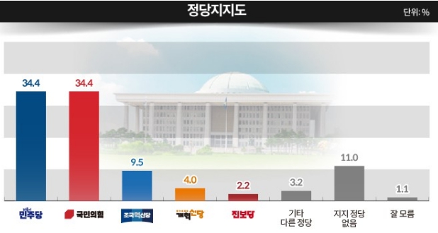 종합뉴스통신사 뉴스핌 의뢰로 여론조사 전문기관 미디어리서치가 지난 28일~29일 이틀간 전국 만 18세 이상 남녀 1001명을 대상으로 정당 지지율을 조사한 결과 민주당과 국민의힘이 34.4%로 동률을 이뤘다.