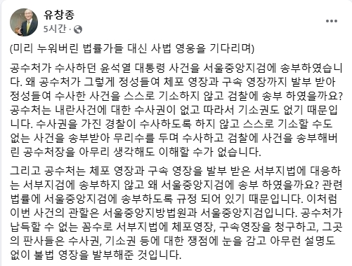 [시사우리신문]유창종 전 서울중앙지검장이 23일 페이스북을 통해 '미리 누워버린 법률가들 대신 사법 영웅을 기다리며'라는 제목으로 "공수처가 납득할 수 없는 꼼수로 서부지법에 체포영장, 구속영장을 청구하고, 그곳의 판사들은 수사권, 기소권 등에 대한 쟁점에 눈을 감고 아무런 설명도 없이 불법 영장을 발부해준 것"이라며"판사가 영장을 발부한다고 해서 없는 수사권과 기소권한이 생길 수는 없고 영장 발부 판사들도 불법 구금 책임의 공범이 될 뿐"이라고 저격하면서"지금이라도 바로 구속을 취소하는 것이 옳지 않겠습니까?"라고 게재했다.